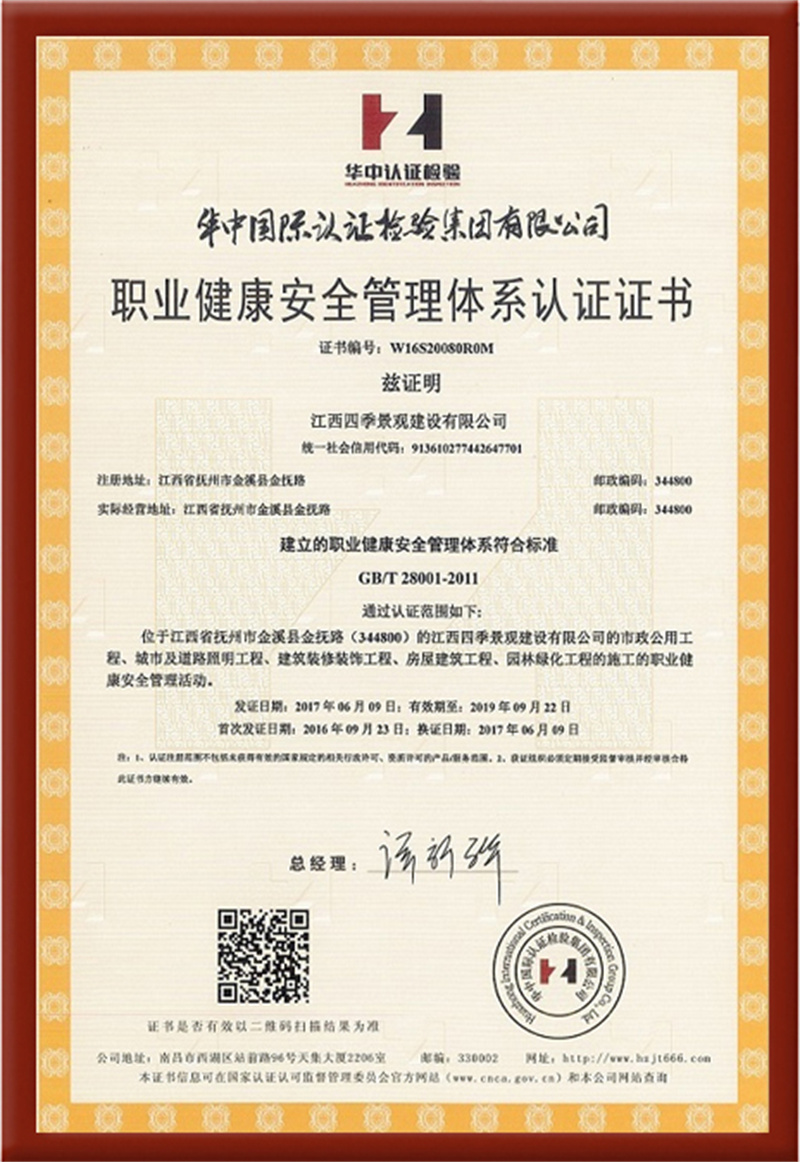 职业健康安全管理体系认证证书